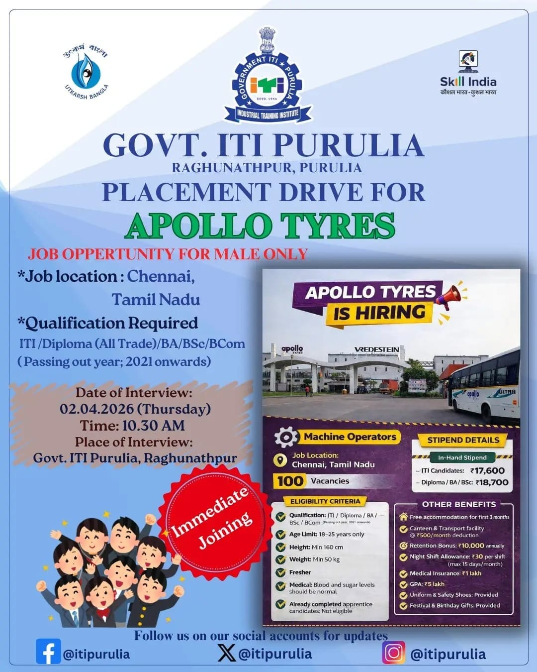 यह भर्ती प्रक्रिया Government Industrial Training Institute Purulia, रघुनाथपुर, पुरुलिया में आयोजित होगी, जिसमें योग्य उम्मीदवारों को Machine Operator के पद पर नौकरी दी जाएगी। इस भर्ती के माध्यम से कुल 100 पदों पर चयन किया जाएगा और चयनित उम्मीदवारों की जॉब लोकेशन Chennai, Tamil Nadu रहेगी।