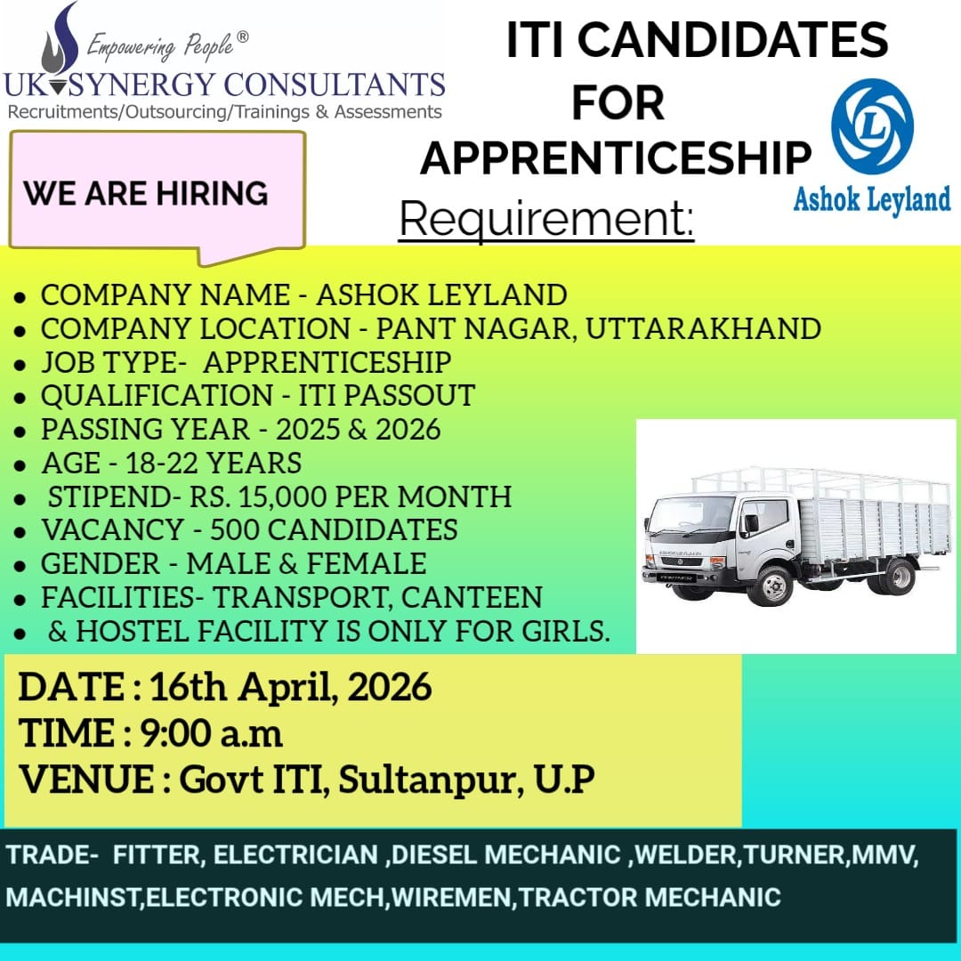 Apply for Ashok Leyland Plant Vacancies 2026. ITI pass candidates can attend walk-in interview for 500 apprenticeship posts with ₹15,000 stipend.