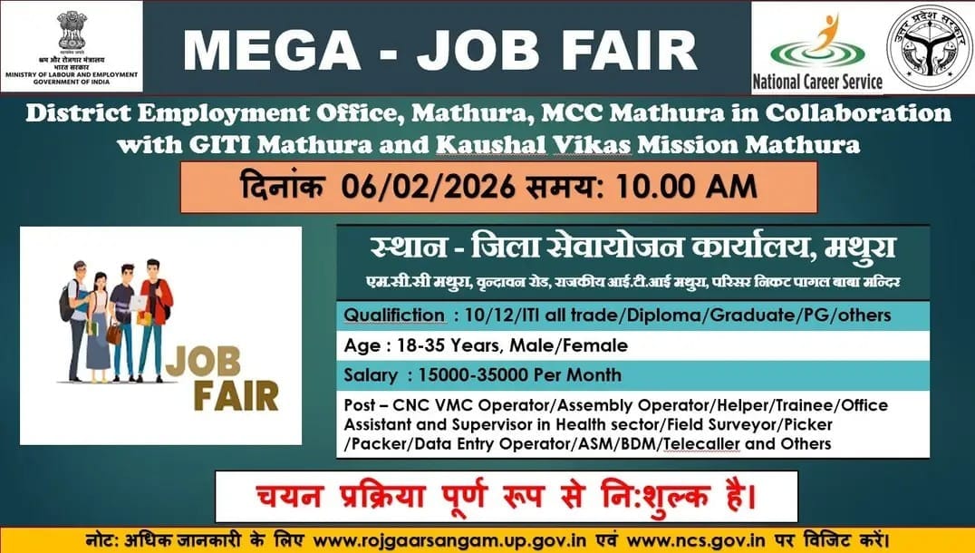 District Employment Office Mathura में 06-02-2026 को प्रमुख कंपनियों, द्वारा Campus Placement का आयोजन किया जा रहा है। यह आयोजन विशेष रूप से पुरुष के लिए है, जिसमें चयनित उम्मीदवार को उस कंपनी मे वर्क करना होगा.