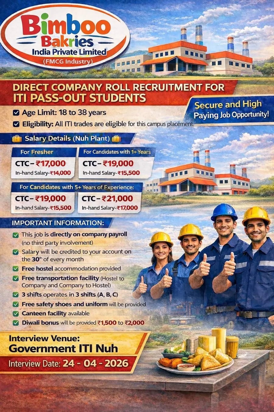 Apply for Bimboo Bakries Job 2026. Direct company roll recruitment for ITI pass candidates with salary up to ₹21,000. Walk-in interview on 24 April.