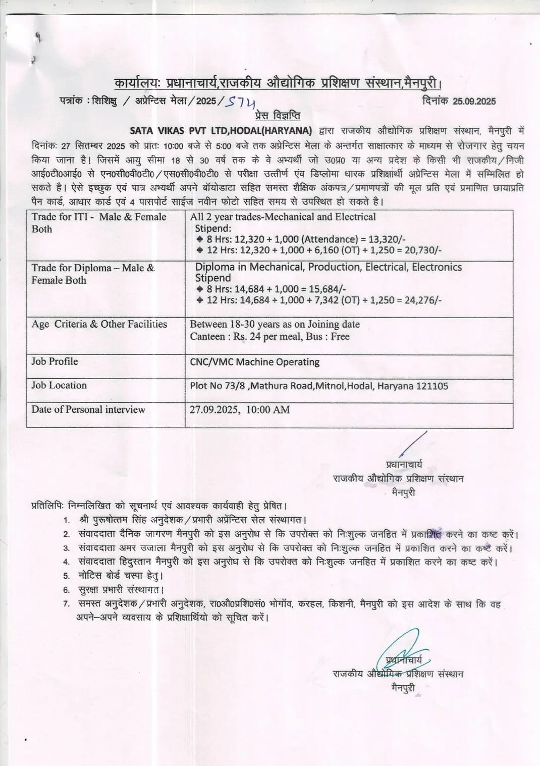 राजकीय औद्योगिक प्रशिक्षण संस्थान, मैनपुरी में दिनांक 27 सितम्बर 2025 को अप्रेन्टिस मेला आयोजित किया जा रहा है। इस मेले में 18 से 30 वर्ष आयु वर्ग के आईटीआई एवं डिप्लोमा धारक अभ्यर्थियों के लिए रोजगार का सुनहरा अवसर उपलब्ध होगा।