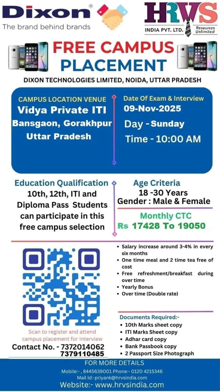 Apply now for Dixon Technology Jobs 2025! Free campus placement for 10th, 12th, ITI, and Diploma students at Vidya Private ITI, Gorakhpur on 9 Nov 2025. Great salary, free meals, yearly bonus & more!