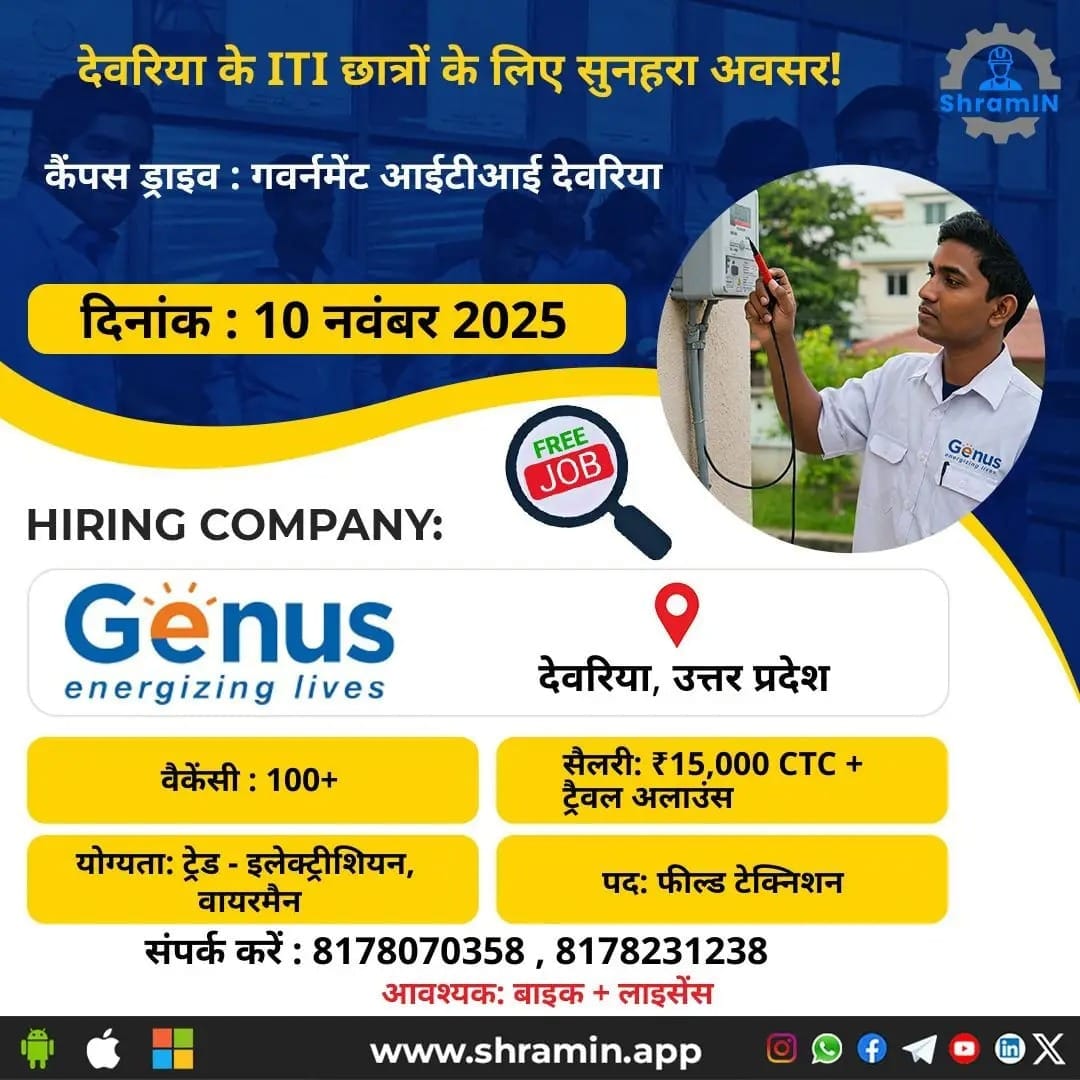 Apply now for Genus Field Technician Jobs 2025 at Government ITI Deoria. 100+ vacancies for ITI Electrician and Wireman trades. Salary ₹15,000 + travel allowance.