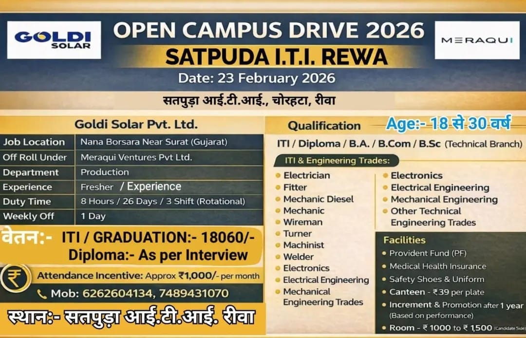 Goldi Solar Recruitment 2026 – तकनीकी एवं स्नातक अभ्यर्थियों के लिए प्राइवेट सेक्टर में नई भर्ती प्रक्रिया शुरू की गई है। Goldi Solar Pvt. Ltd. द्वारा ओपन कैंपस ड्राइव 2026 का आयोजन किया जा रहा है, जिसमें ITI, डिप्लोमा एवं ग्रेजुएशन उत्तीर्ण उम्मीदवार भाग ले सकते हैं। यह भर्ती मैन्युफैक्चरिंग सेक्टर के प्रोडक्शन विभाग के लिए आयोजित की जा रही है।