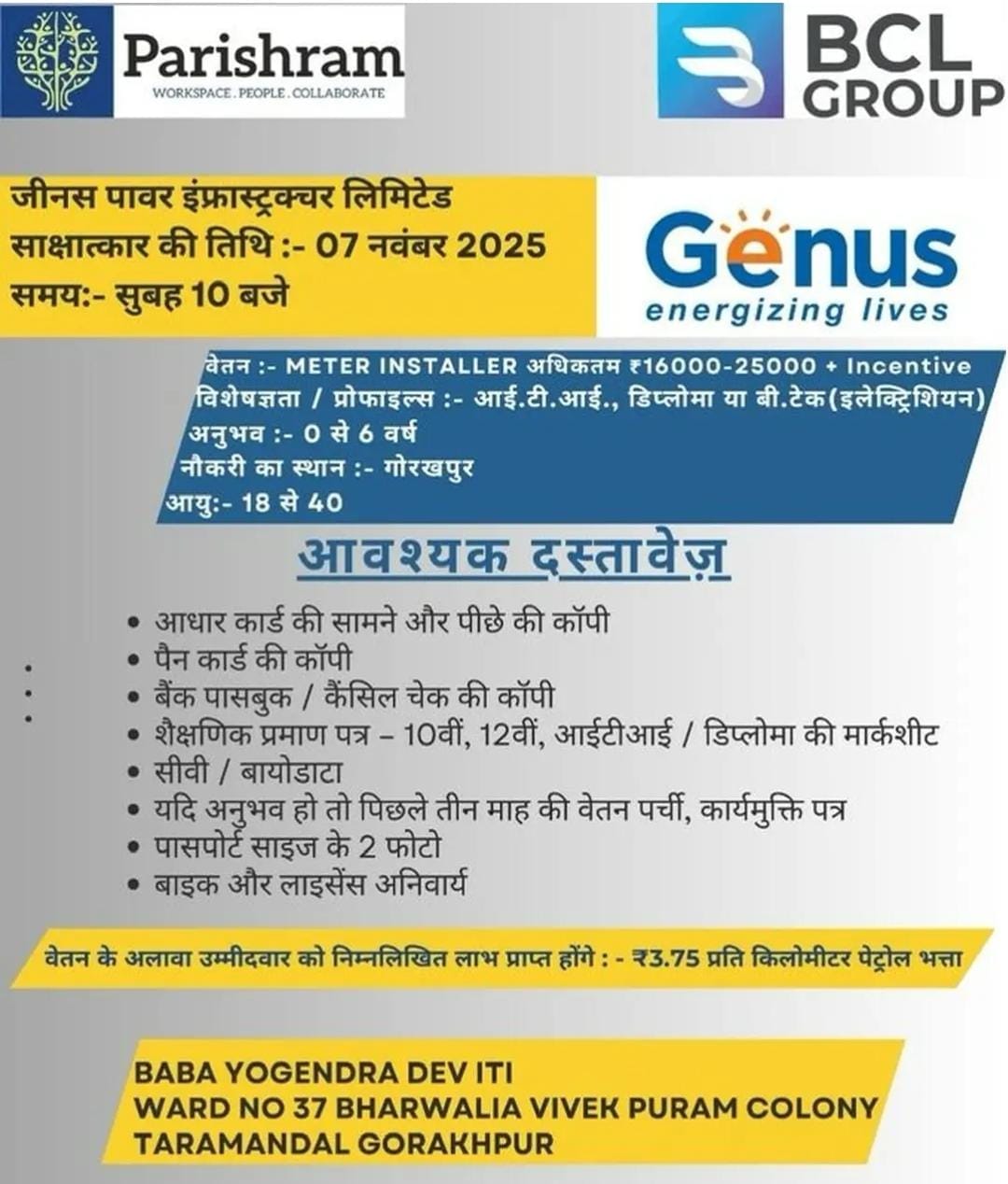 इस भर्ती में अनुभव 0 से 6 वर्ष, आयु सीमा 18 से 40 वर्ष, और बाइक व लाइसेंस आवश्यक हैं। इच्छुक उम्मीदवार अपने सभी दस्तावेज़ों सहित Baba Yogendra Dev ITI, तारामंडल, गोरखपुर में इंटरव्यू के लिए उपस्थित हों।
