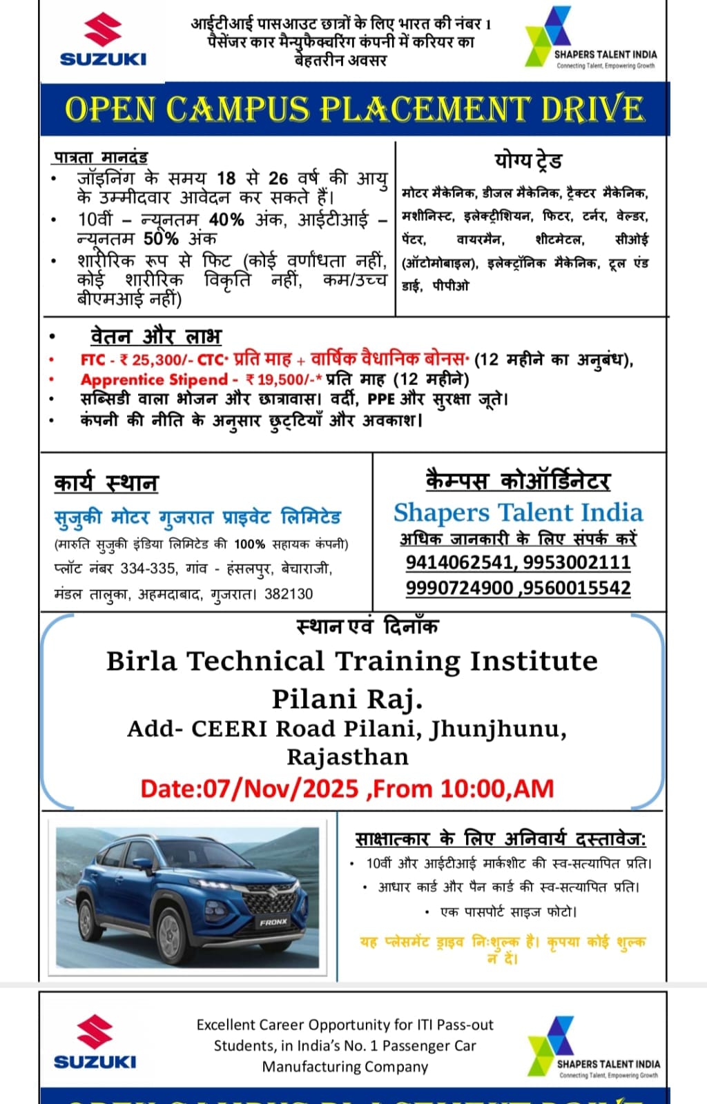 - उम्मीदवारों को सुबह 10:00 बजे तक Birla Technical Training Institute, Pilani (Rajasthan), के परिसर में पहुँचना होगा।