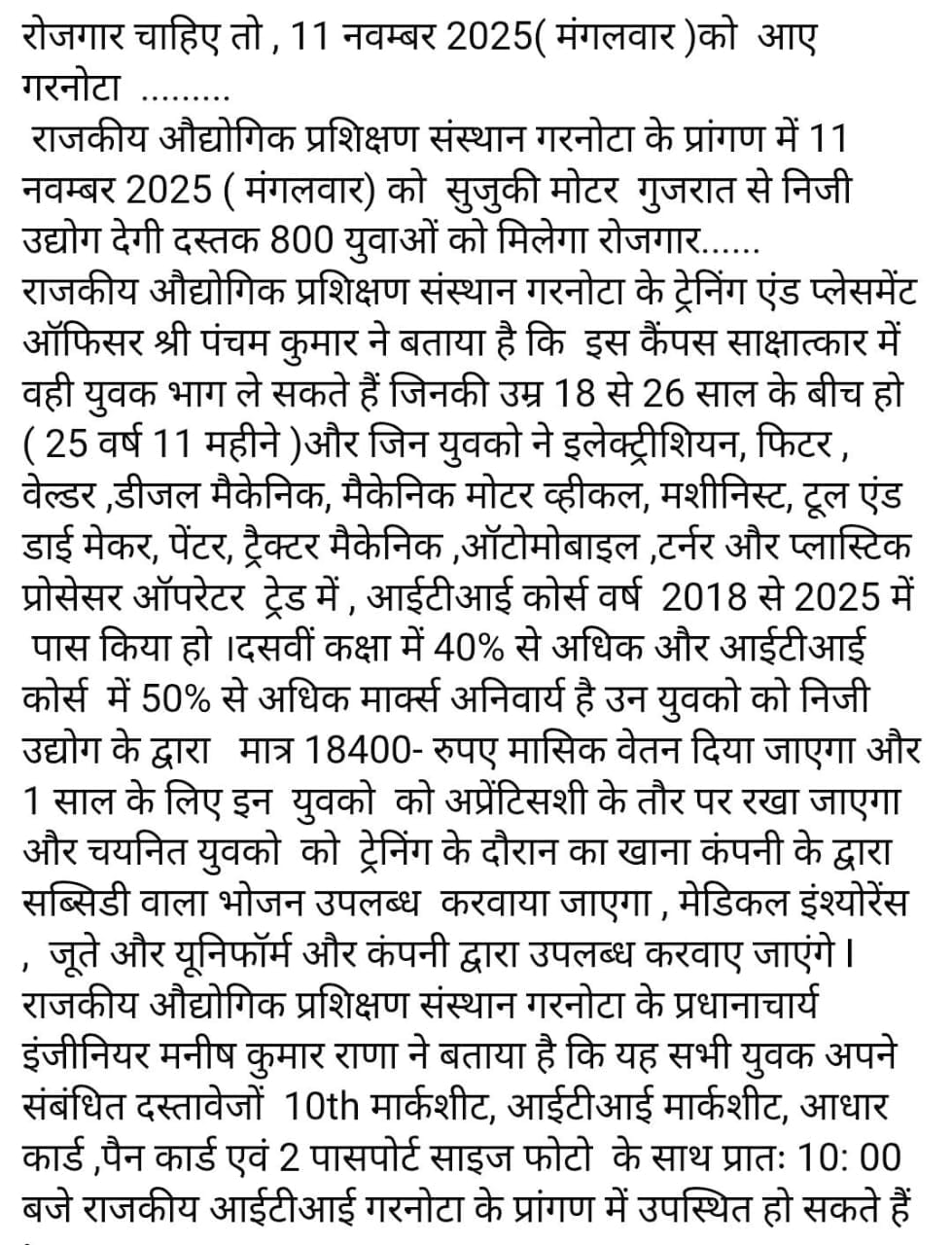 - उम्मीदवारों को सुबह 10:00 बजे तक Government Industrial Training Institute, Garnota के परिसर में पहुँचना होगा।