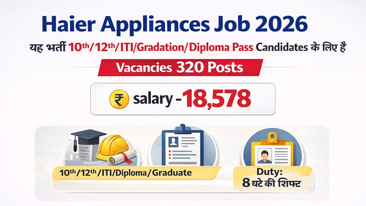 Haier Appliances Job 2026 – Private Sector में नई Campus Placement 2026 भर्ती आयोजित की जा रही है। यह भर्ती 10th/12th/ITI/Graduation/Diploma Pass Candidates के लिए है और चयन Direct Interview के माध्यम से किया जाएगा। यह भर्ती Private Manufacturing Company द्वारा आयोजित की जा रही है। चयनित उम्मीदवारों को Machine Operator / Production / Apprentice Trainee प्रोफाइल पर नियुक्त किया जाएगा।