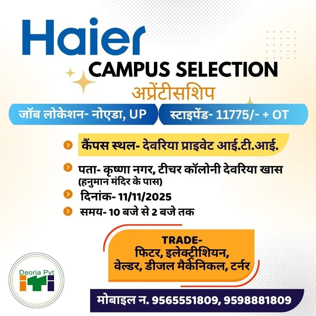 Haier Company Jobs 2025 में सभी आईटीआई पास उम्मीदवारों के लिए सुनहरा अवसर आया है। इस बार Haier कंपनी की ओर से अप्रेंटिसशिप के लिए भर्ती कैंपस देवरिया प्राइवेट आई.टी.आई. में आयोजित की जा रही है। यह कैंपस 11 नवंबर 2025 को सुबह 10 बजे से दोपहर 2 बजे तक होगा। चयनित उम्मीदवारों को नोएडा, उत्तर प्रदेश में कार्य करना होगा। कं