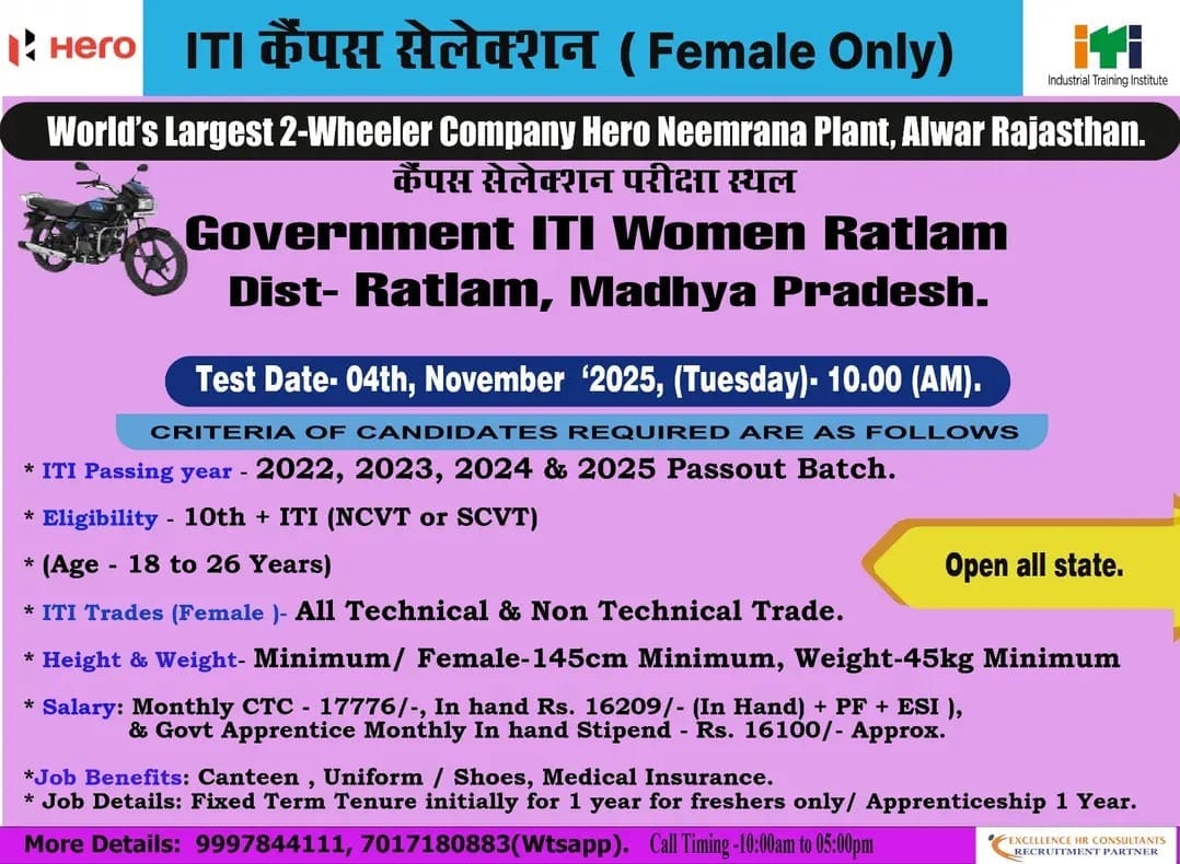 यह भर्ती Neemrana Plant (Alwar, Rajasthan) के लिए है और Hero Company Job 2025 चयन केंद्र Government ITI Women, Ratlam (Madhya Pradesh) रखा गया है।