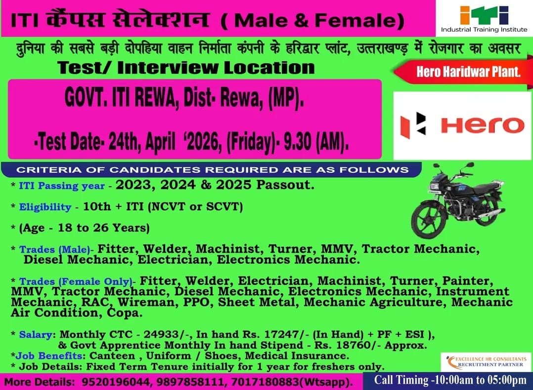 Two-wheeler manufacturing industry में career start करने के लिए एक और strong chance आया है। Hero MotoCorp के Haridwar Plant (Uttarakhand)के लिए ITI candidates का Campus Selection Drive 2026 conduct किया जा रहा है।