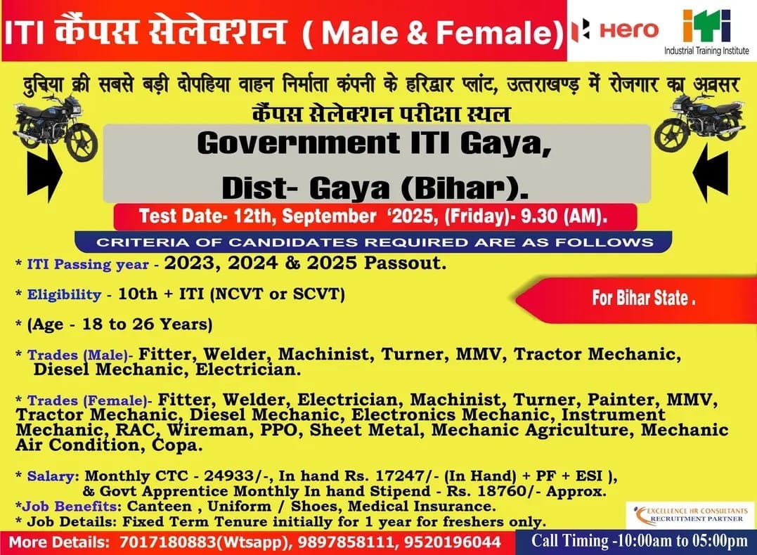 आईटीआई पासआउट छात्रों के लिए साल 2025 में रोजगार का एक सुनहरा अवसर आया है। इस बार कैंपस सेलेक्शन का आयोजन राजकीय आईटीआई Gaya (बिहार) में किया जा रहा है। यह मौका खासतौर पर उन उम्मीदवारों के लिए है, जिन्होंने वर्ष 2023, 2024 या 2025 में आईटीआई (NCVT/SCVT) पास किया है।