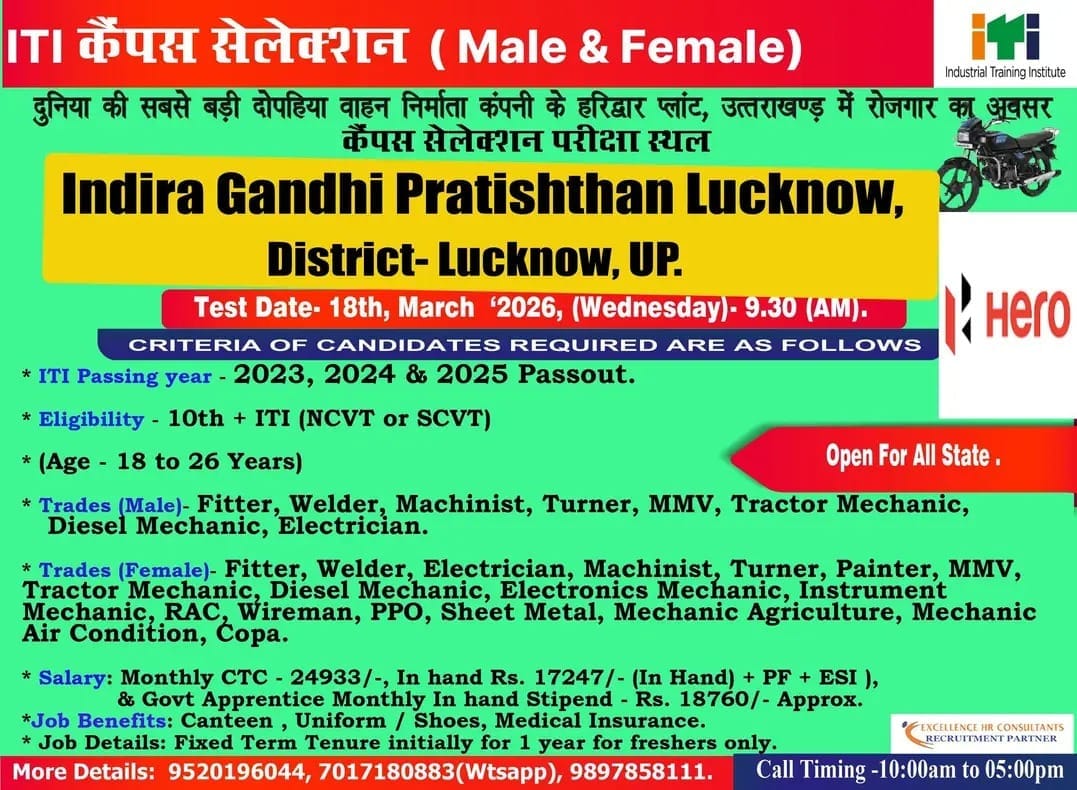 आईटीआई पासआउट के लिए साल 2026 में रोजगार का एक सुनहरा अवसर आया है। इस बार कैंपस सेलेक्शन का आयोजन Indra Gandhi Partishthan में किया जा रहा है। यह मौका खासतौर पर उन उम्मीदवारों के लिए है, जिन्होंने वर्ष 2023, 2024 या 2025 में आईटीआई (NCVT/SCVT) पास किया है।