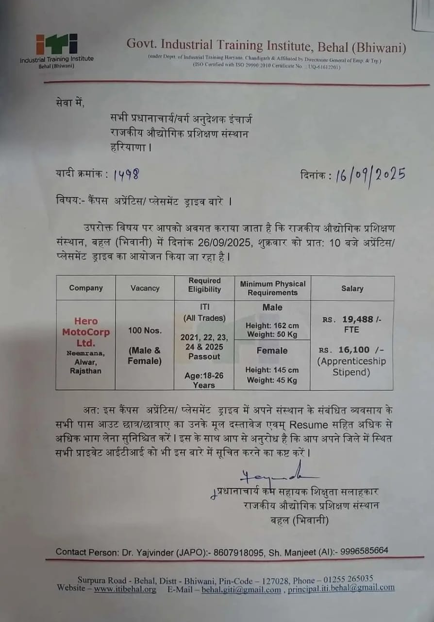 • उम्मीदवारों को सुबह 10:00 बजे तक Govt. Industrial Training Institute, Behal (Bhiwani), के परिसर में पहुँचना होगा।