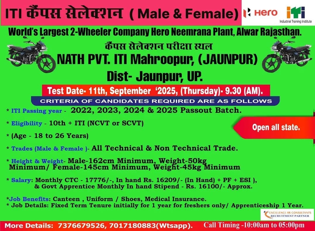 Apply online for Hero Vacancy 2025 through ITI campus placement. Hero MotoCorp ITI pass jobs, private sector recruitment, and career opportunities in manufacturing.