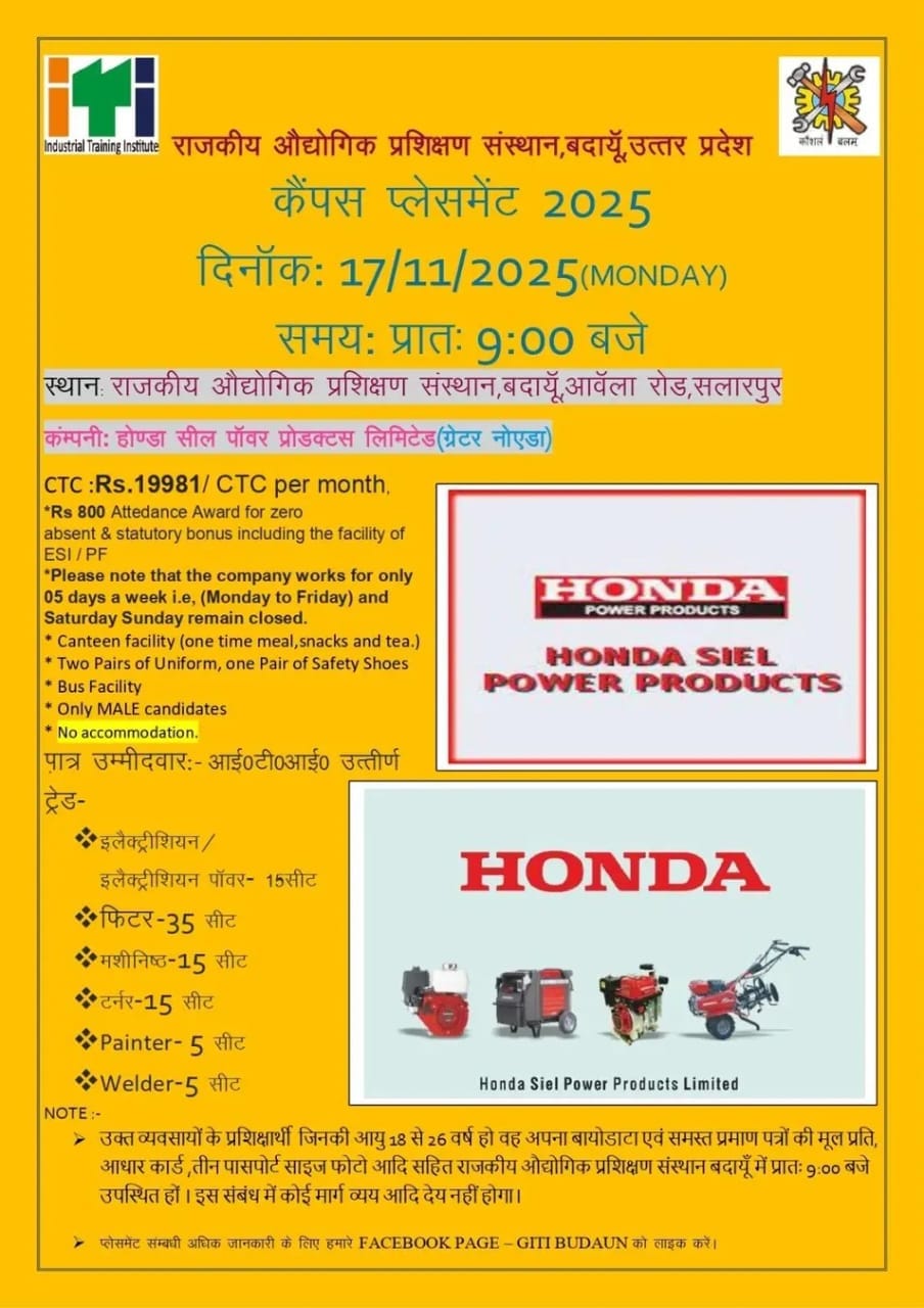 Honda Siel Power Products Limited, Greater Noida द्वारा ITI Industrial Training Institute, Badaun में आयोजित होने वाला कैंपस प्लेसमेंट 2025 युवाओं के लिए एक सुनहरा अवसर है। यह प्लेसमेंट 17 नवंबर 2025, सोमवार को सुबह 9:00 बजे आयोजित होगा, जिसमें केवल पुरुष अभ्यर्थी शामिल हो सकते हैं।