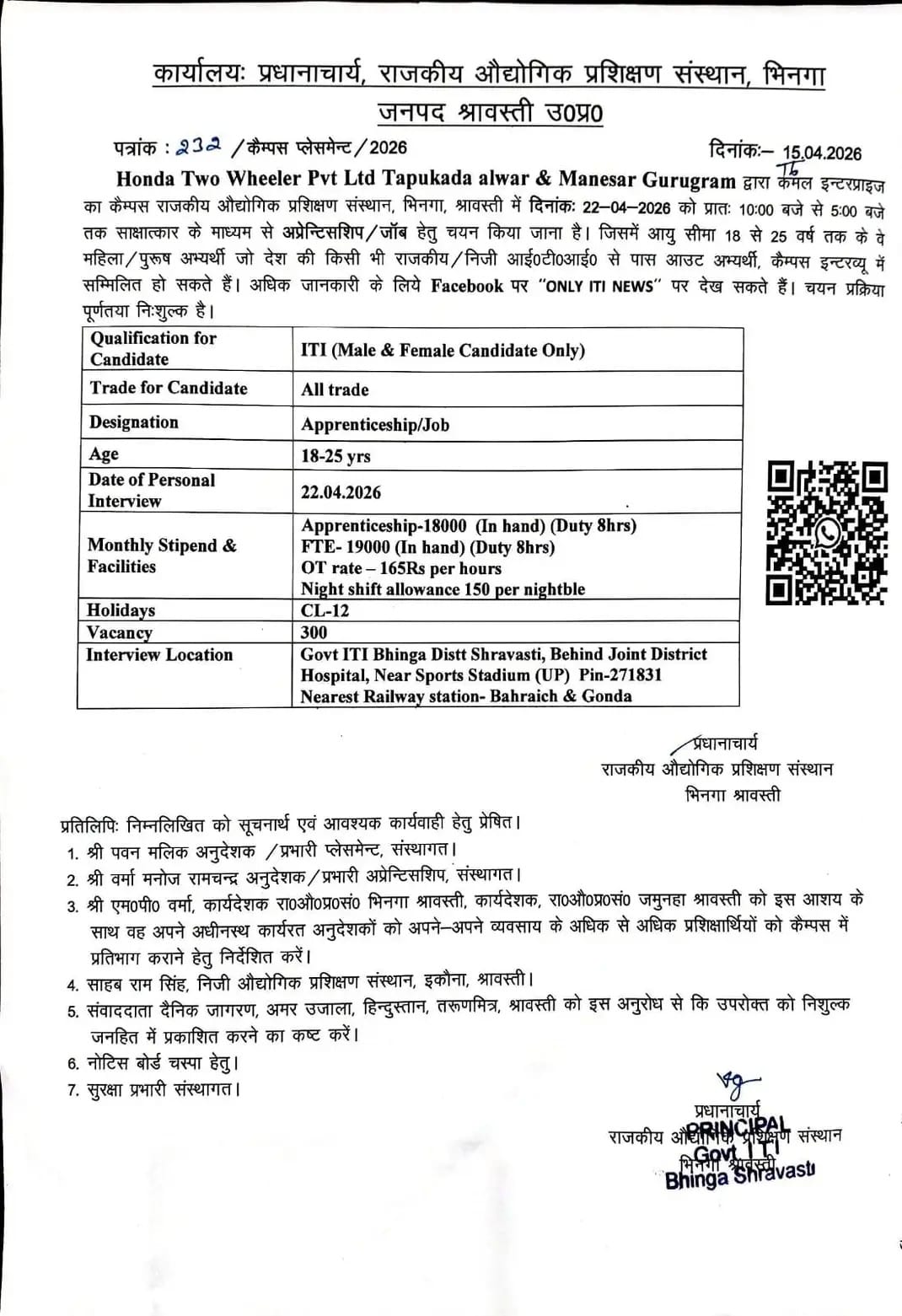 राजकीय औद्योगिक प्रशिक्षण संस्थान (ITI), भिनगा, जनपद श्रावस्ती में आईटीआई पास युवाओं के लिए एक शानदार रोजगार अवसर आया है। Honda Two Wheeler Pvt Ltd द्वारा कमल इंटरप्राइज के माध्यम से 22 अप्रैल 2026 को एक बड़े कैम्पस प्लेसमेंट ड्राइव का आयोजन किया जा रहा है।