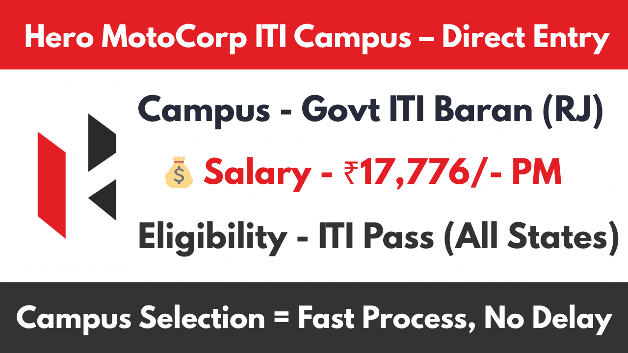 ITI Campus Selection 2026 – Hero MotoCorp द्वारा ITI Campus Selection 2026 का आयोजन किया जा रहा है। यह recruitment दुनिया की सबसे बड़ी 2-wheeler manufacturing company के Neemrana Plant (Alwar, Rajasthan) के लिए है।