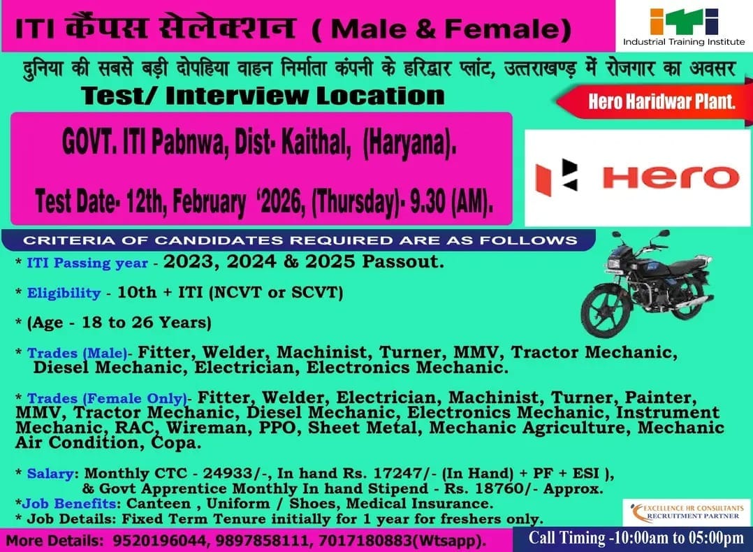 भारत की प्रमुख कंपनियों में आईटीआई पासआउट युवाओं के लिए वर्ष 2026 में रोजगार का सुनहरा अवसर आया है। Hero MotoCorp, देश की सबसे बड़ी दोपहिया वाहन निर्माता कंपनी, अपने हरिद्वार प्लांट के लिए आईटीआई छात्रों की भर्ती कर रही है। यह ITI Company Job Vacancy 2026 विशेष रूप से 2023, 2024 और 2025 पासआउट उम्मीदवारों के लिए आयोजित की जा रही है।