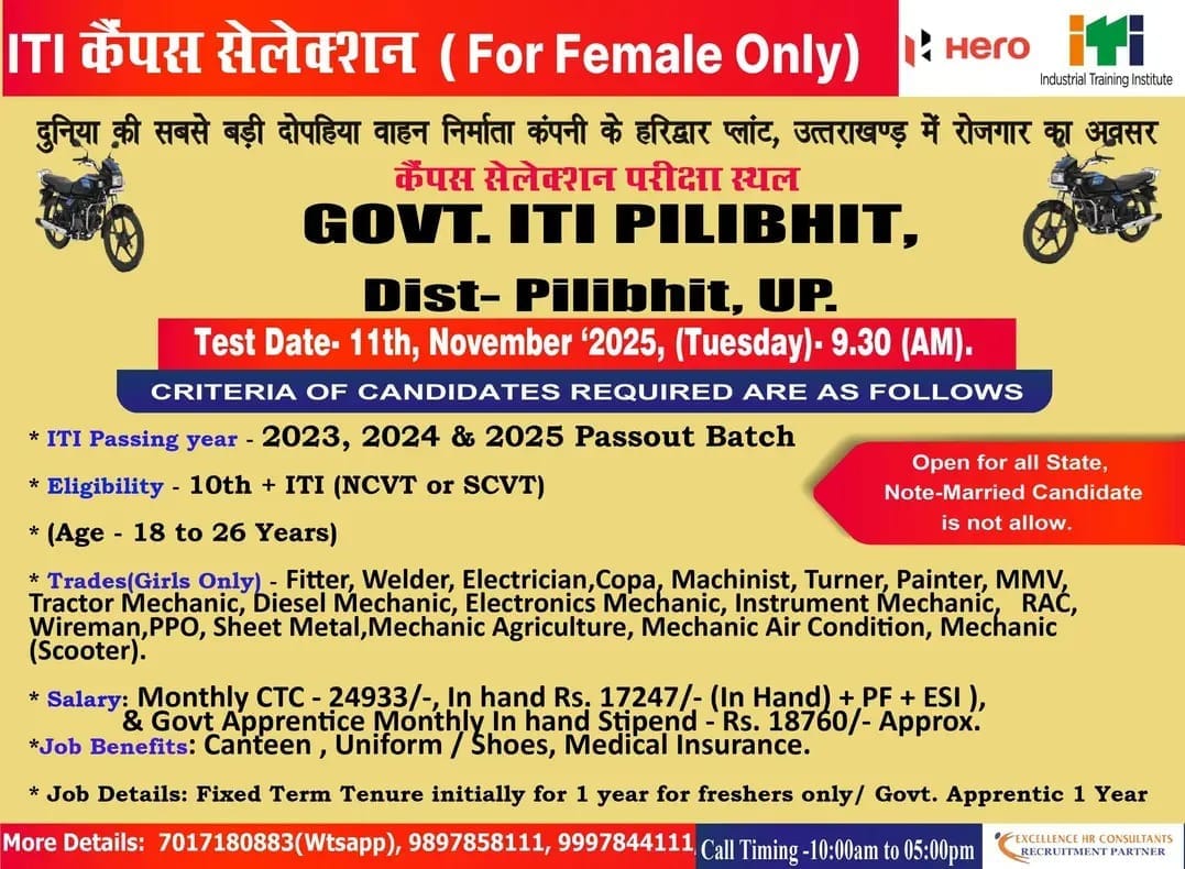 भारत की सबसे बड़ी दोपहिया वाहन निर्माता कंपनी Hero MotoCorp लेकर आई है महिला अभ्यर्थियों के लिए एक सुनहरा रोजगार अवसर। कंपनी के हरिद्वार प्लांट (उत्तराखंड) में ITI पासआउट छात्राओं (2023, 2024, 2025 बैच) के लिए कैंपस सेलेक्शन आयोजित किया जा रहा है। यह भर्ती केवल महिला उम्मीदवारों (Female Only) के लिए है।