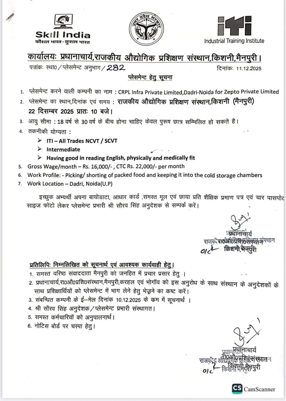 - उम्मीदवारों को सुबह 10:00 बजे तक Government Industrial Training Institute, Kishani (Mainpuri) के परिसर में पहुँचना होगा।