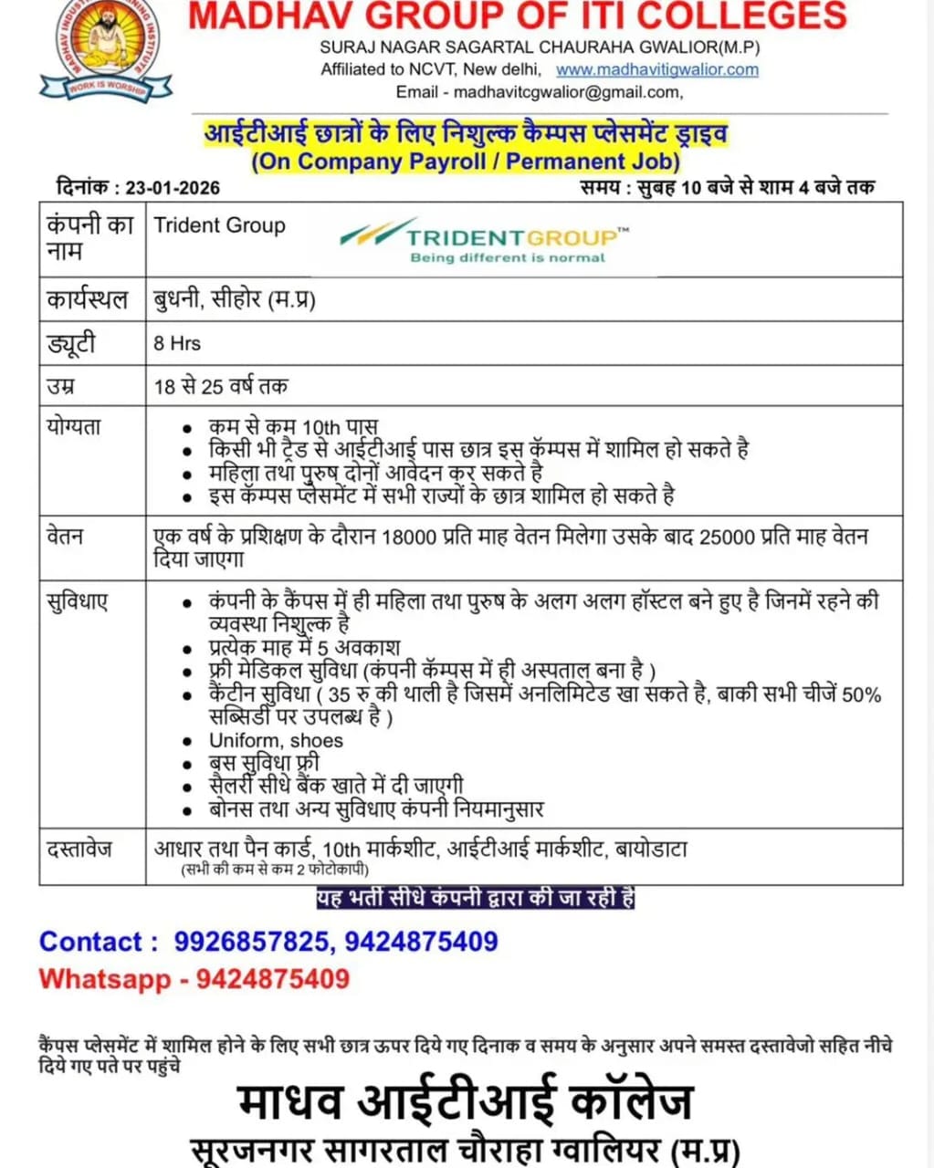 Campus Interview Location : Madhav Group of ITI Colleges, Suraj Nagar, Sagartal Square, Gwalior (Madhya Pradesh)