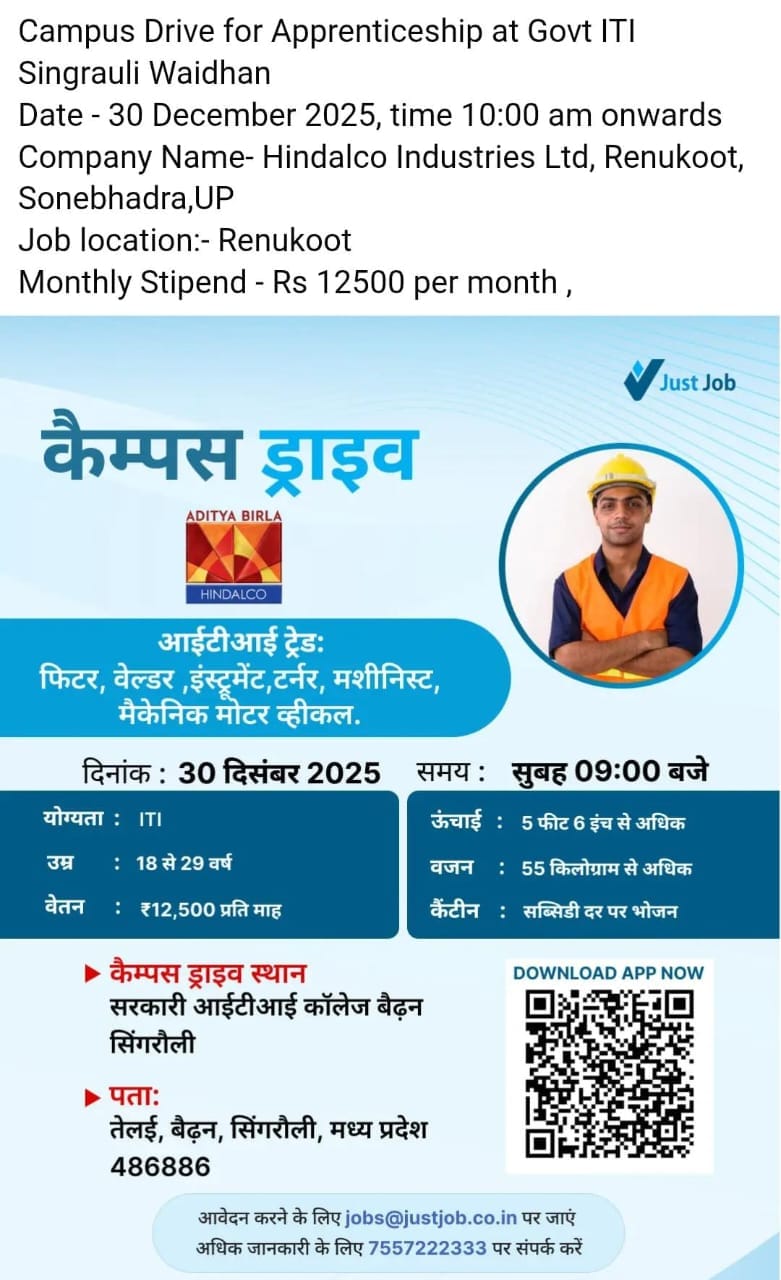 Campus Interview Location : Government ITI College, Baidhan, Telai, Baidhan, Singrauli, Madhya Pradesh