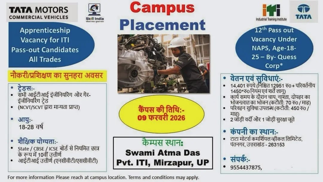 चयन प्रक्रिया कंपनी के नियमानुसार की जाएगी तथा सभी योग्य अभ्यर्थियों को campus के दिन आवश्यक दस्तावेज़ों के साथ उपस्थित होना होगा। यह apprenticeship vacancy NCVT / SCVT से मान्यता प्राप्त ITI pass candidates के लिए है।