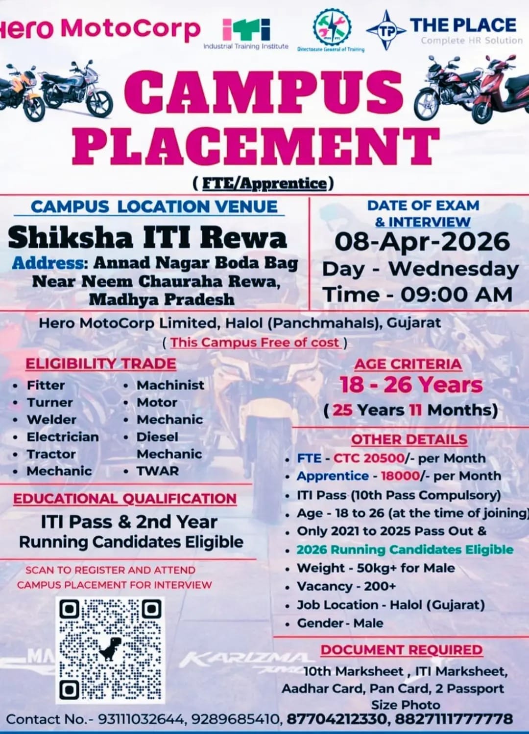 Campus Interview Location : Shiksha ITI Rewa, Annad Nagar Boda Bag, Near Neem Chauraha, Rewa, Madhya Pradesh