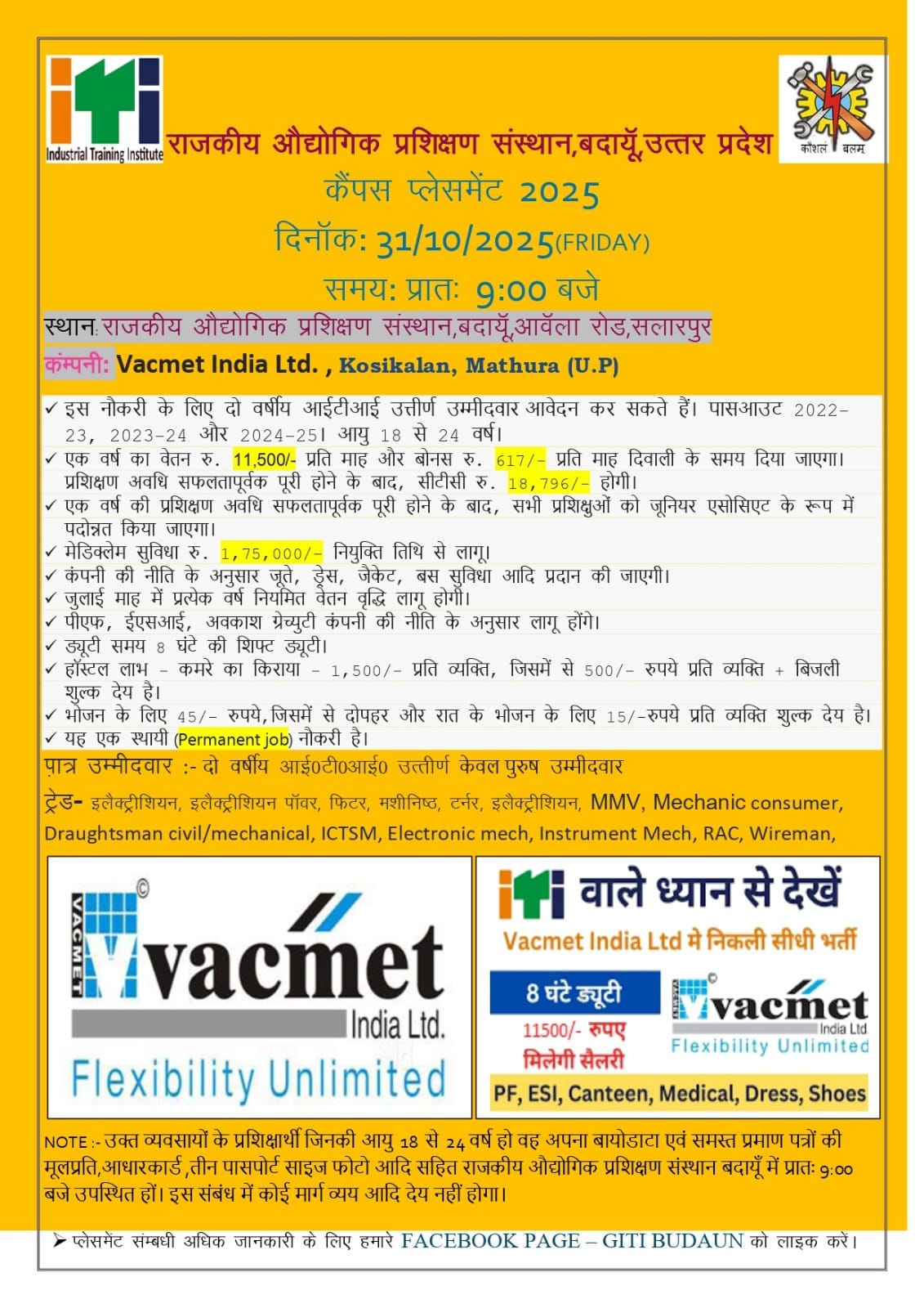 Vacmet India Ltd., कोसिकला मथुरा (उत्तर प्रदेश) में आईटीआई पास युवाओं के लिए एक शानदार अवसर लेकर आई है। कंपनी द्वारा 31 अक्टूबर 2025 (शुक्रवार) को राजकीय औद्योगिक प्रशिक्षण संस्थान, बदायूँ में कैंपस प्लेसमेंट का आयोजन किया जा रहा है।