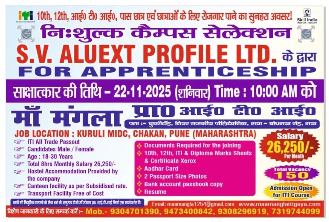 Apply for ITI Recruitment in Pune 2025. S.V. ALUEXT PROFILE LTD offers 150 Apprentice vacancies with ₹26,250 salary, free hostel, canteen & transport.