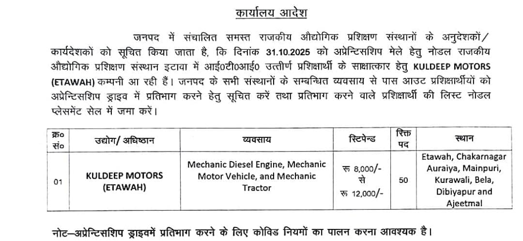 जनपद इटावा में संचालित सभी राजकीय औद्योगिक प्रशिक्षण संस्थानों के आईटीआई उत्तीर्ण अभ्यर्थियों के लिए सुनहरा अवसर आया है। ITI Vacancy In Etawah 2025 दिनांक 31 अक्टूबर 2025 को नोडल राजकीय औद्योगिक प्रशिक्षण संस्थान, इटावा में अप्रेंटिसशिप मेले का आयोजन किया जा रहा है, जिसमें KULDEEP MOTORS (ETAWAH) कंपनी भाग ले रही है।