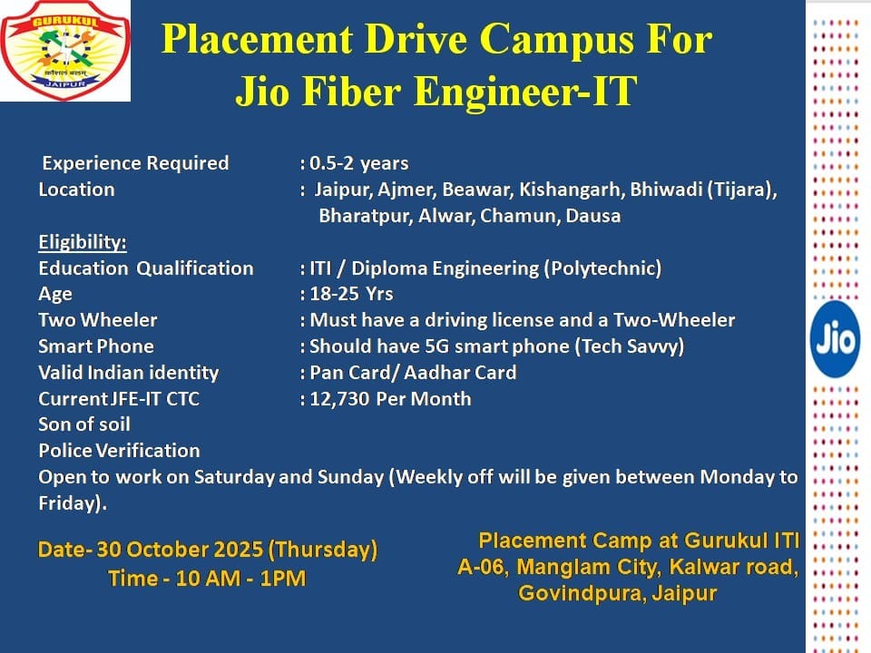 Jio Fiber Recruitment 2025 at Gurukul ITI Jaipur offers great job opportunities for ITI and Diploma candidates. Salary ₹12,730 per month. Work locations across Rajasthan.