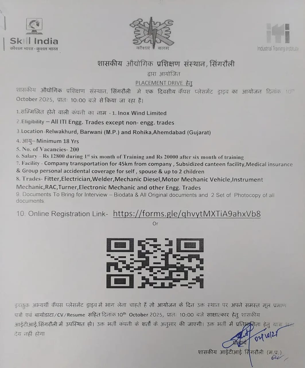 भारत सरकार के Skill India (कौशल भारत) अभियान के अंतर्गत युवाओं को रोजगार से जोड़ने के लिए विभिन्न अवसर उपलब्ध कराए जा रहे हैं। इसी कड़ी में शासकीय औद्योगिक प्रशिक्षण संस्थान, सिंगरौली (म.प्र.) द्वारा वर्ष 2025 में आईटीआई कैंपस प्लेसमेंट ड्राइव का आयोजन किया जा रहा है। यह प्लेसमेंट ड्राइव दिनांक 10 अक्टूबर 2025, प्रातः 10:00 बजे से शुरू होगा।