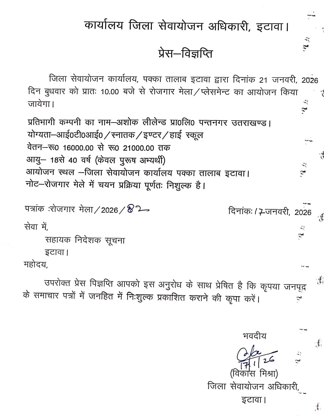 - उम्मीदवारों को सुबह 10:00 बजे तक District Employment Office, Pakka Talab, Etawah, के परिसर में पहुँचना होगा।