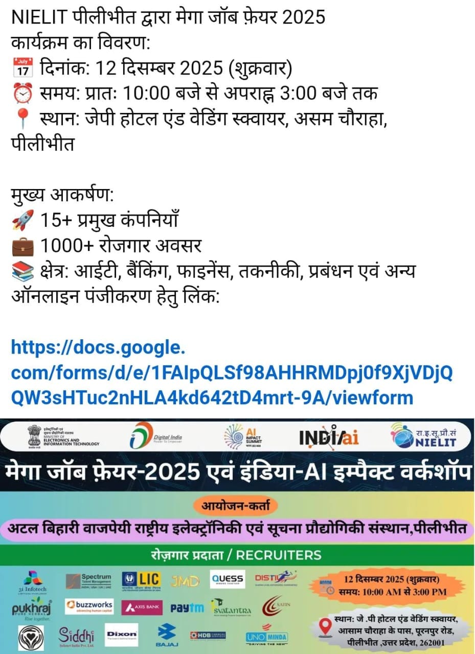 यह कार्यक्रम 12 दिसम्बर 2025 को जे.पी. होटल एंड वेडिंग स्क्वायर, असम चौराहा, पीलीभीत में आयोजित होगा, जहाँ 1000 से अधिक रोजगार अवसर उपलब्ध रहेंगे। इस जॉब फेयर में आईटी, बैंकिंग, फाइनेंस, तकनीकी, प्रबंधन सहित अन्य कई सेक्टर्स में नौकरियाँ प्रदान की जाएंगी।