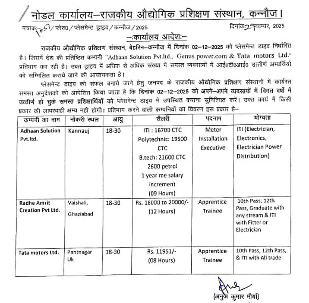 - उम्मीदवारों को सुबह 10:00 बजे तक Government Industrial Training Institute, Behrin-Kannauj के परिसर में पहुँचना होगा।
