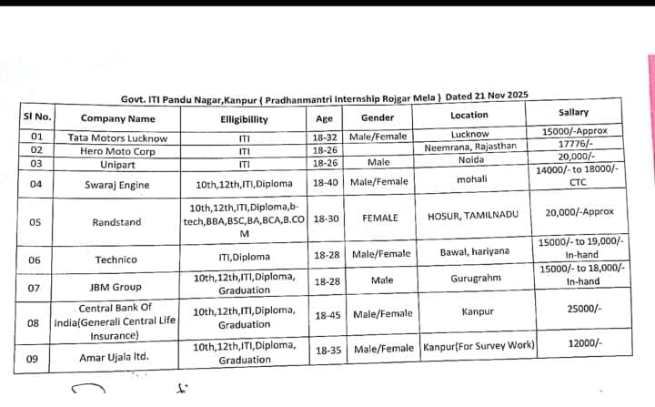 - उम्मीदवारों को सुबह 09:00 बजे तक Govt. ITI Pandu Nagar, Kanpur के परिसर में पहुँचना होगा।