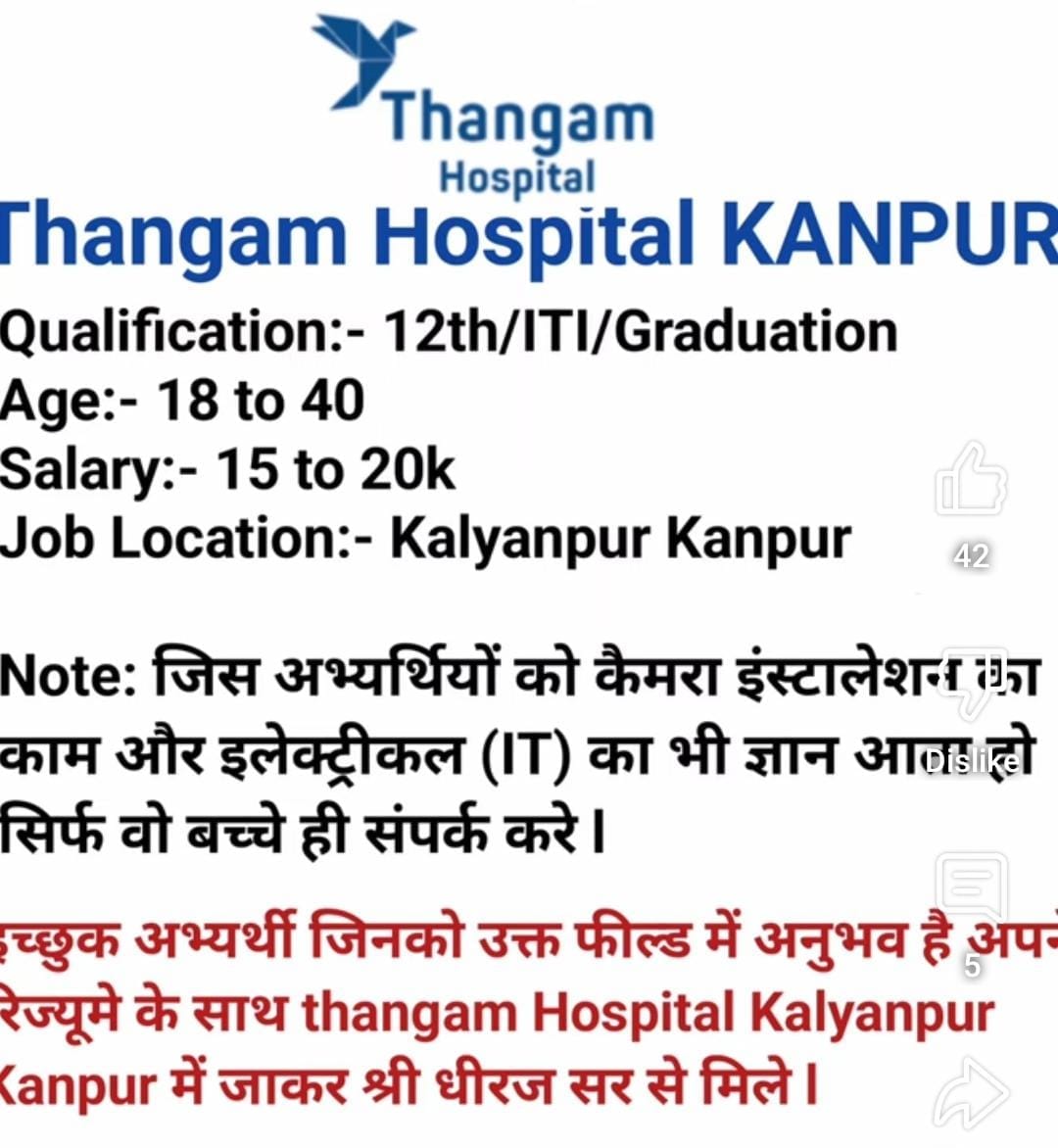 Note: Interested candidates who have experience in the above field can go to Thangam Hospital Kalyanpur 5 Kanpur with their resume and meet Mr. Dheeraj Sir.