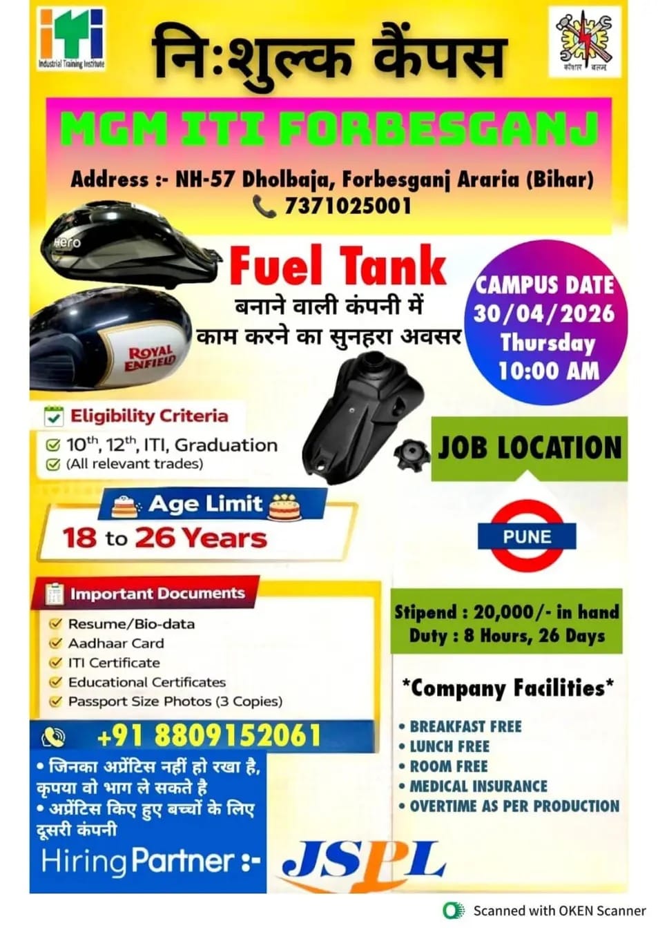 Campus Interview Location : MGM ITI Forbesganj, NH-57, Dholbaja, Forbesganj, Araria (Bihar)
