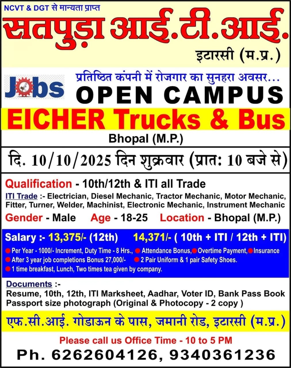 Campus Interview Location : Satpuda Pvt ITI Near FCI Godown, Zamani Road, Itarsi (Madhya Pradesh)