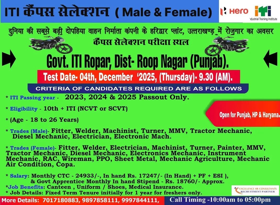 यह चयन परीक्षा Govt ITI Ropar में 04 December 2025, शुक्रवार सुबह 9:30 बजे आयोजित होगी। इस भर्ती में ITI पासआउट वर्ष 2023, 2024 और 2025 के उम्मीदवार शामिल हो सकते हैं।