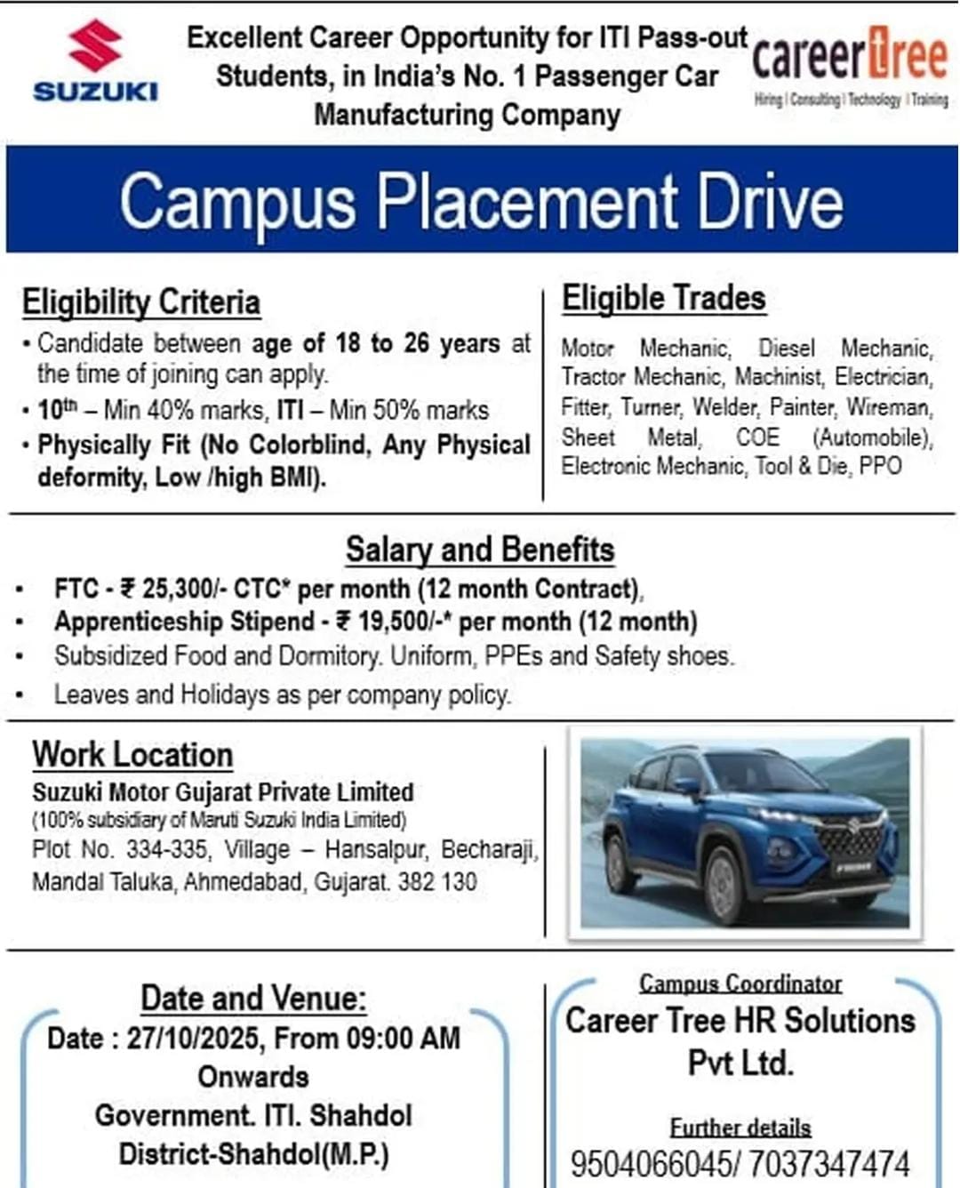 भारत की नंबर 1 पैसेंजर कार निर्माता कंपनी Suzuki Motor Gujarat Pvt. Ltd. ITI पासआउट छात्रों के लिए एक शानदार करियर अवसर लेकर आई है। गुजरात में होने वाली इस कैंपस प्लेसमेंट ड्राइव के माध्यम से योग्य उम्मीदवारों को रोजगार और ट्रेनिंग का मौका मिलेगा। यह कैंपस ड्राइव 27 अक्टूबर 2025 को Government ITI, Shahdol में आयोजित होगी।