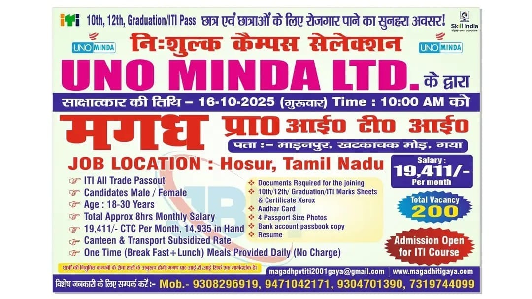 उम्मीदवारों को कंपनी की शर्तों के अनुसार Hosur Tamil Nadu ITI Vacancy में नियुक्त किया जाएगा। इच्छुक अभ्यर्थियों को साक्षात्कार हेतु 16 अक्टूबर 2025 (गुरुवार) को सुबह 10 बजे मगध प्रा० आई०टी०आई०, गया में उपस्थित होना होगा।