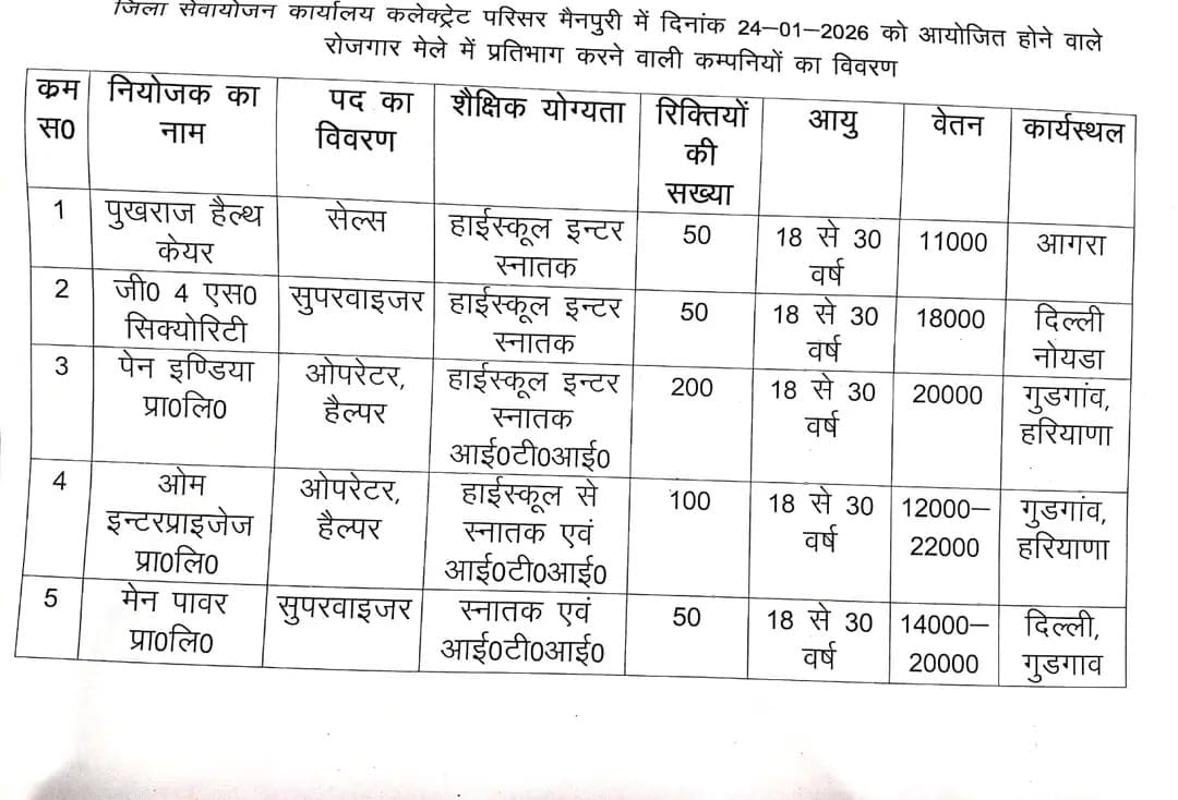 जिला सेवायोजन कार्यालय, कलेक्ट्रेट परिसर मैनपुरी में दिनांक 24-01-2026 को एक महत्वपूर्ण Latest Jobs Mela in Mainpuri 2026 का आयोजन किया जा रहा है। इस रोजगार मेले में विभिन्न निजी कंपनियाँ प्रतिभाग कर रही हैं, जिनके माध्यम से जिले के युवाओं को रोजगार के अवसर उपलब्ध कराए जाएंगे। रोजगार मेले में पुखराज हेल्थ केयर, जी.4.एस. सिक्योरिटी, पेन इंडिया प्रा. लि., ओम इंटरप्राइजेज प्रा. लि. एवं मेन पावर प्रा. लि. जैसी कंपनियाँ शामिल होंगी।