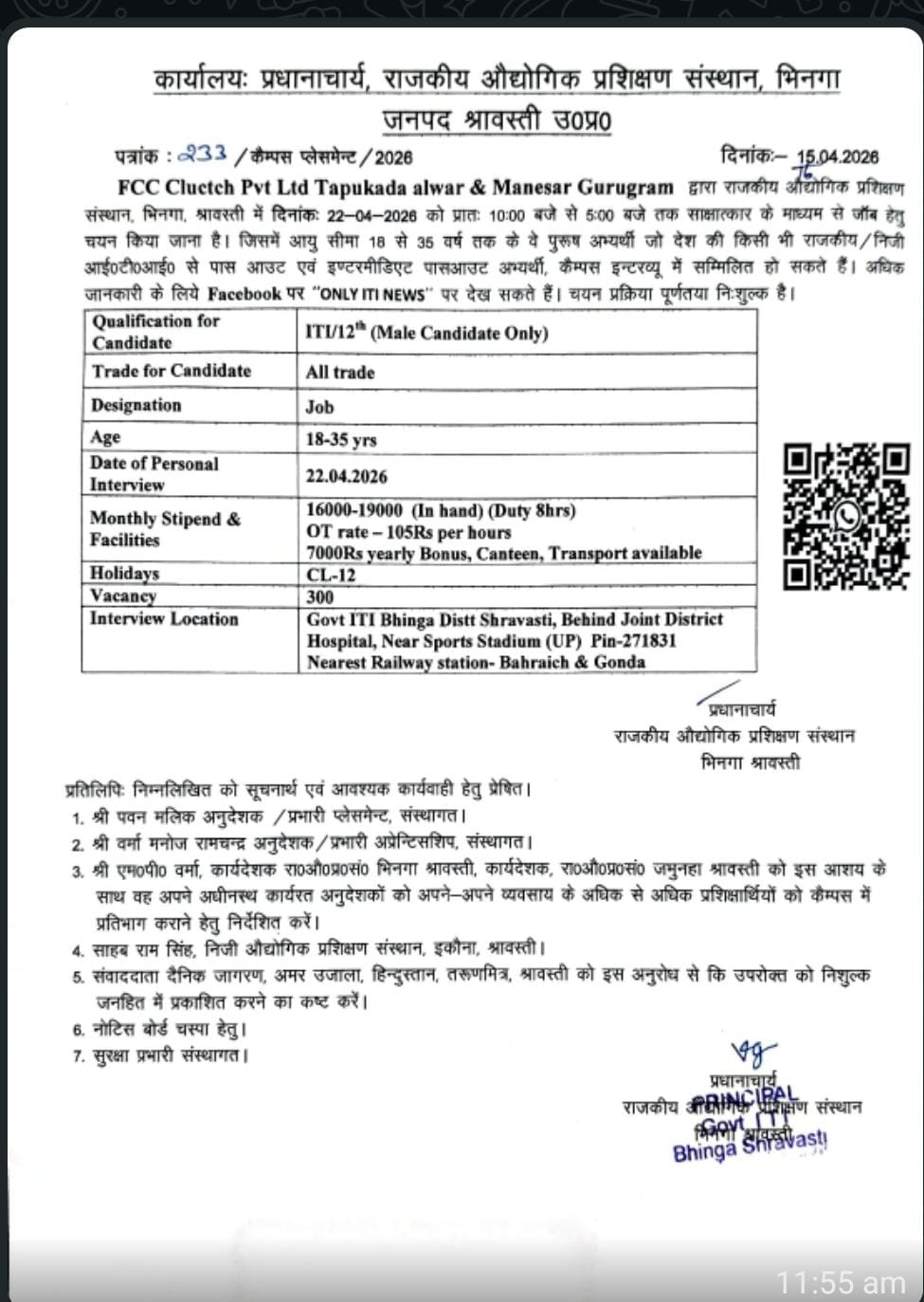 Campus Interview Location : Government Industrial Training Institute (ITI), Bhinga, Shravasti, Uttar Pradesh