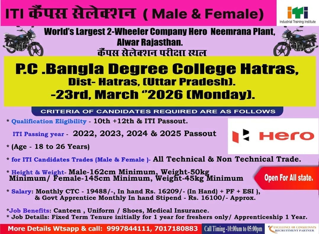 World’s largest two-wheeler company Hero MotoCorp के Neemrana Plant (Alwar, Rajasthan) में ITI Campus Selection 2026 का आयोजन किया जा रहा है। यह भर्ती Male & Female ITI candidates के लिए है और पूरी तरह से Private Company Job है।