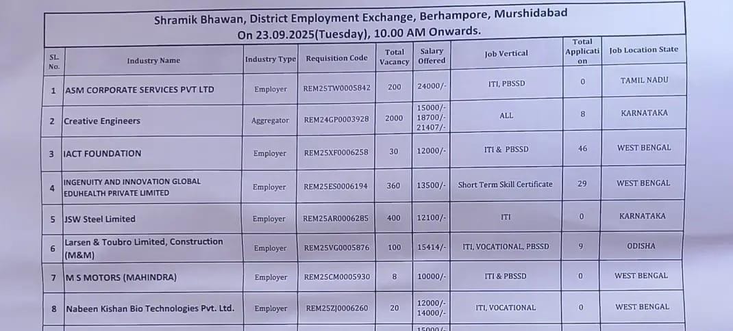 • उम्मीदवारों को सुबह 10:00 बजे तक Shramik Bhawan, District Employment Exchange, Berhampore, Murshidabad, के परिसर में पहुँचना होगा।