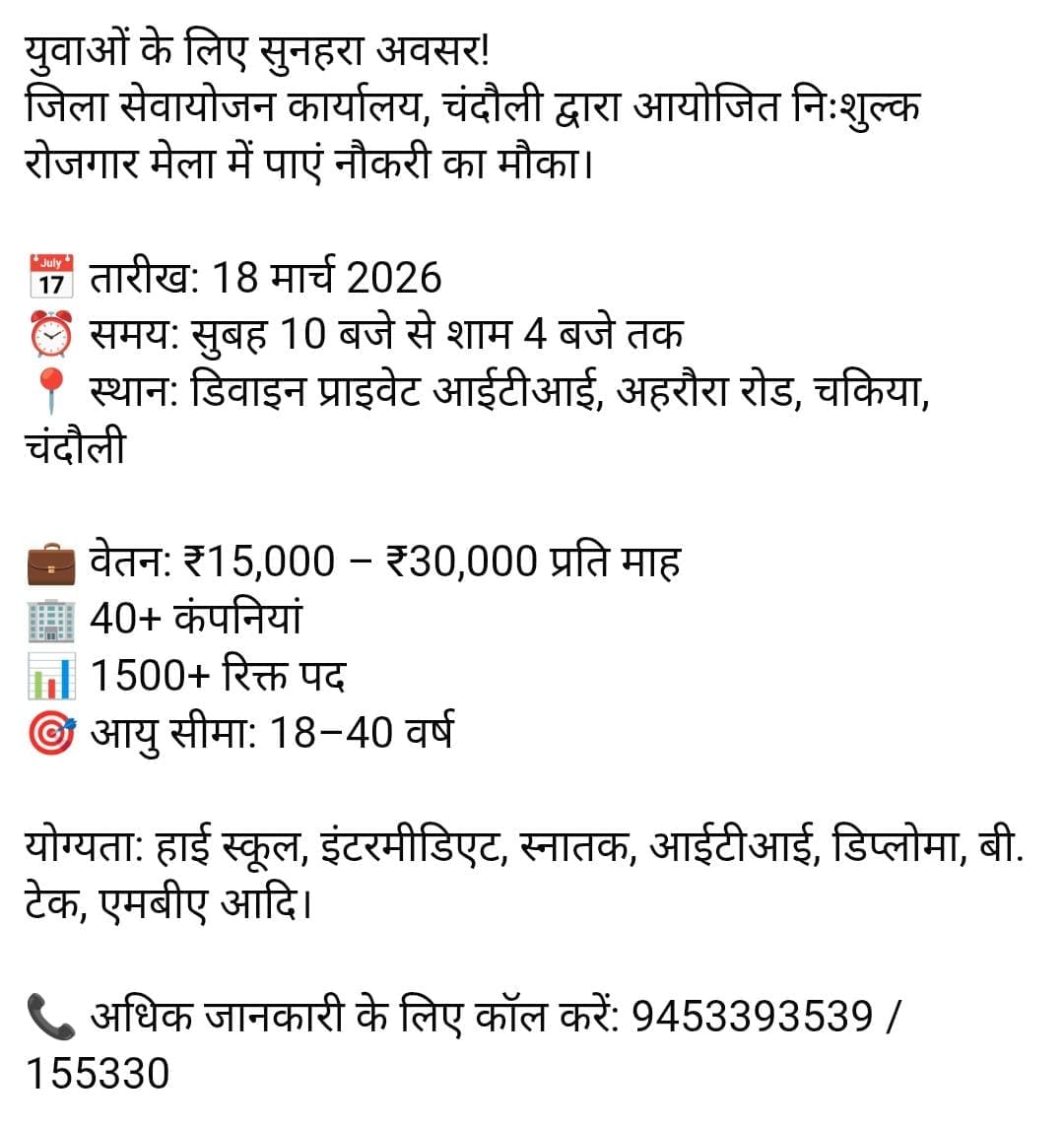 उत्तर प्रदेश के युवाओं के लिए रोजगार पाने का एक बेहतरीन अवसर सामने आया है। जिला सेवायोजन कार्यालय, चंदौली द्वारा एक निःशुल्क रोजगार मेले का आयोजन किया जा रहा है, जिसमें कई बड़ी कंपनियां भाग लेंगी। इस रोजगार मेले में युवाओं को सीधे इंटरव्यू के माध्यम से नौकरी पाने का मौका मिलेगा। यह रोजगार मेला 18 मार्च 2026 को डिवाइन प्राइवेट आईटीआई, अहरौरा रोड, चकिया, चंदौली में आयोजित किया जाएगा। मेले का समय सुबह 10 बजे से शाम 4 बजे तक निर्धारित किया गया है।