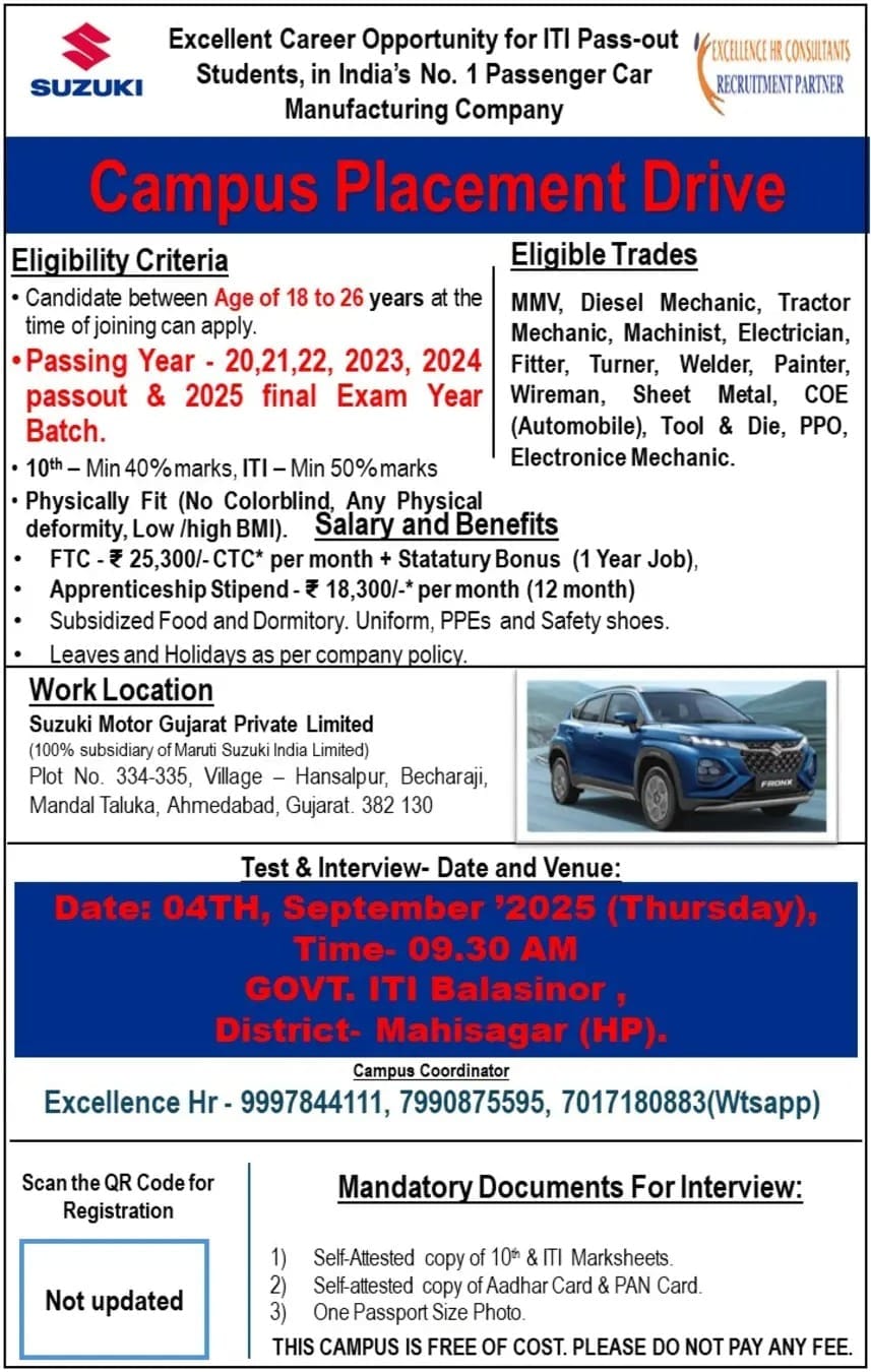 Find the latest Suzuki ITI jobs for freshers 2025. Apply online for Suzuki Motor campus placement & recruitment. ITI pass candidates can join Suzuki company jobs with good salary packages.